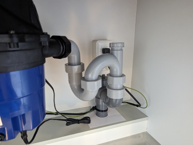 ![]() ↑配管が近い場合は、上のように配管をまとめて接続していますが、必ず清掃口のある高圧洗浄対応トラップ管に変更しなければなりません。 同梱品では高圧洗浄ができないので注意です。 |