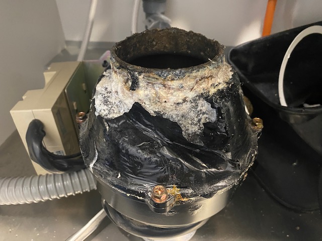 ![]() ↑こちらがセキスイ社の既存機種です。 マンション建設時の2007年に設置されたもので本体の腐食が進行しています。 水平の排水管に何故かゴム!?が使用され、経年で臭いがでます。 実際に外すと配管の中もドロドロ、交換必須です。 |